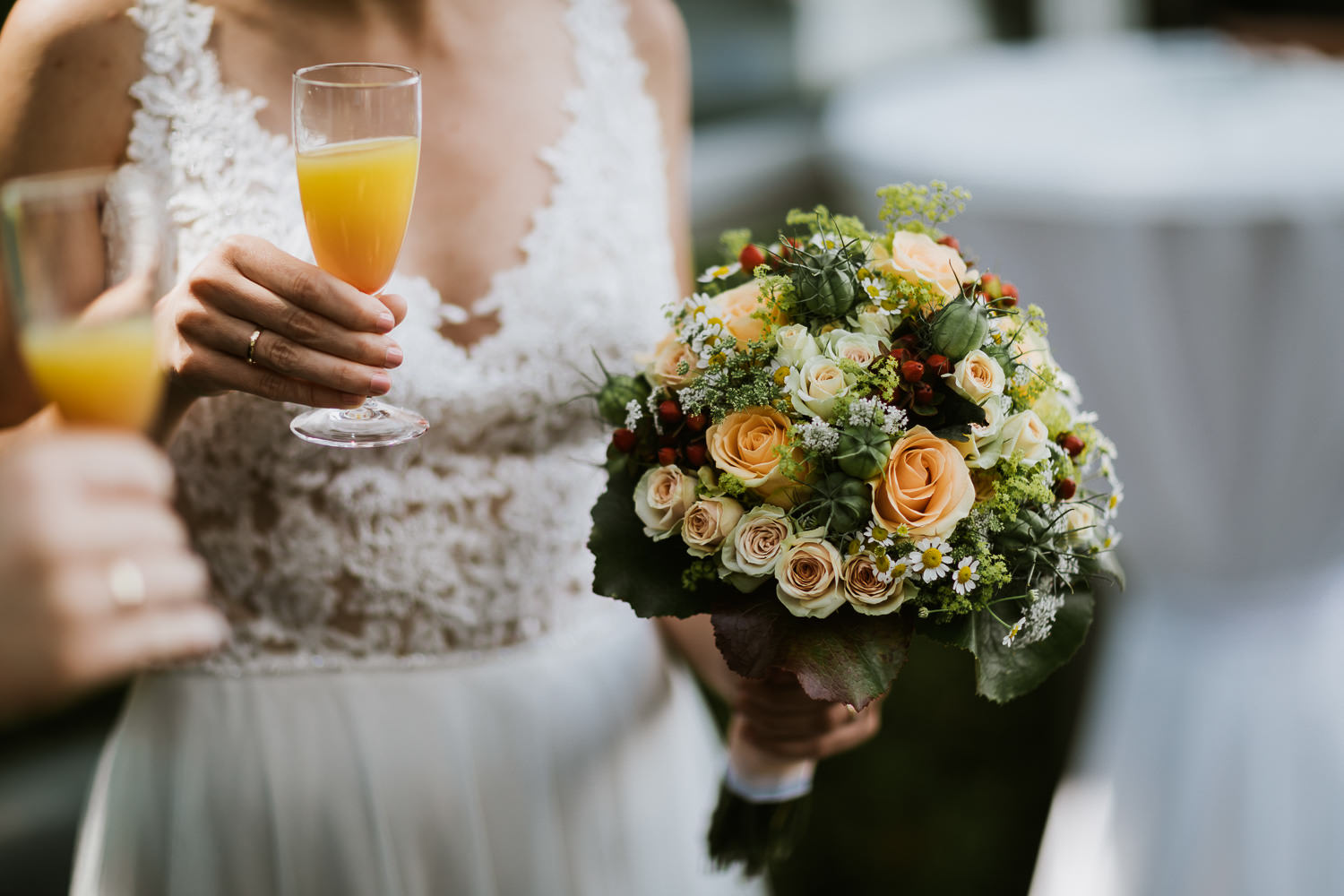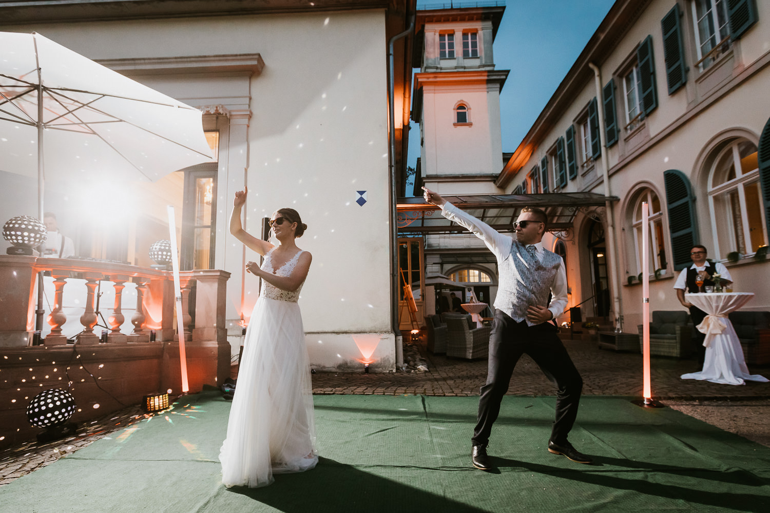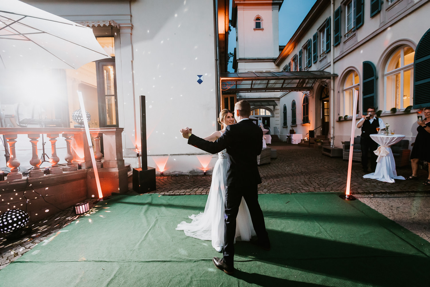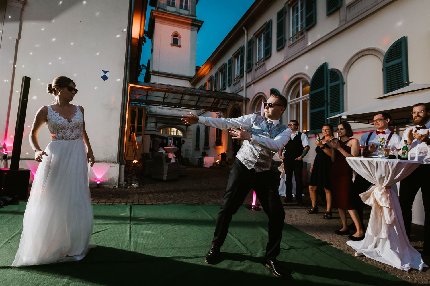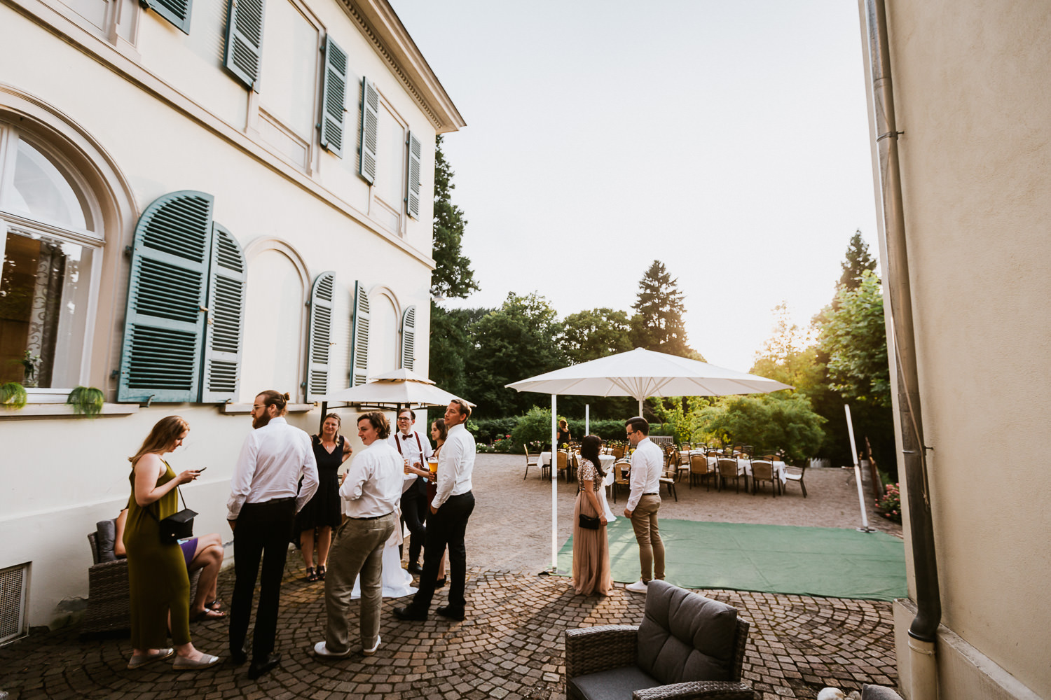 Nach der feierlichen Trauung fuhren wir dann ein paar Meter weiter zum Schloss Heiligenberg. Es gibt hinter der Location ausreichende Parkmöglichkeiten. Da das Wetter wieder einmal unfassbar gut war, fand der Sektempfang im Außenbereich statt. Begleitet wurde dieser von einer tollen Band. Bei ausgelassener Stimmung machten wir zu späteren Stunde das Portraitshooting in. In der Zwischenzeit wurde die Hochzeitsgesellschaft mit kleineren Spielen beschäftigt. Sehr beliebt sind hier unter anderem Gästebücher, Malaufgaben und natürlich das Photobooth.