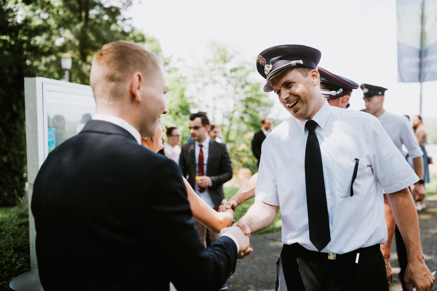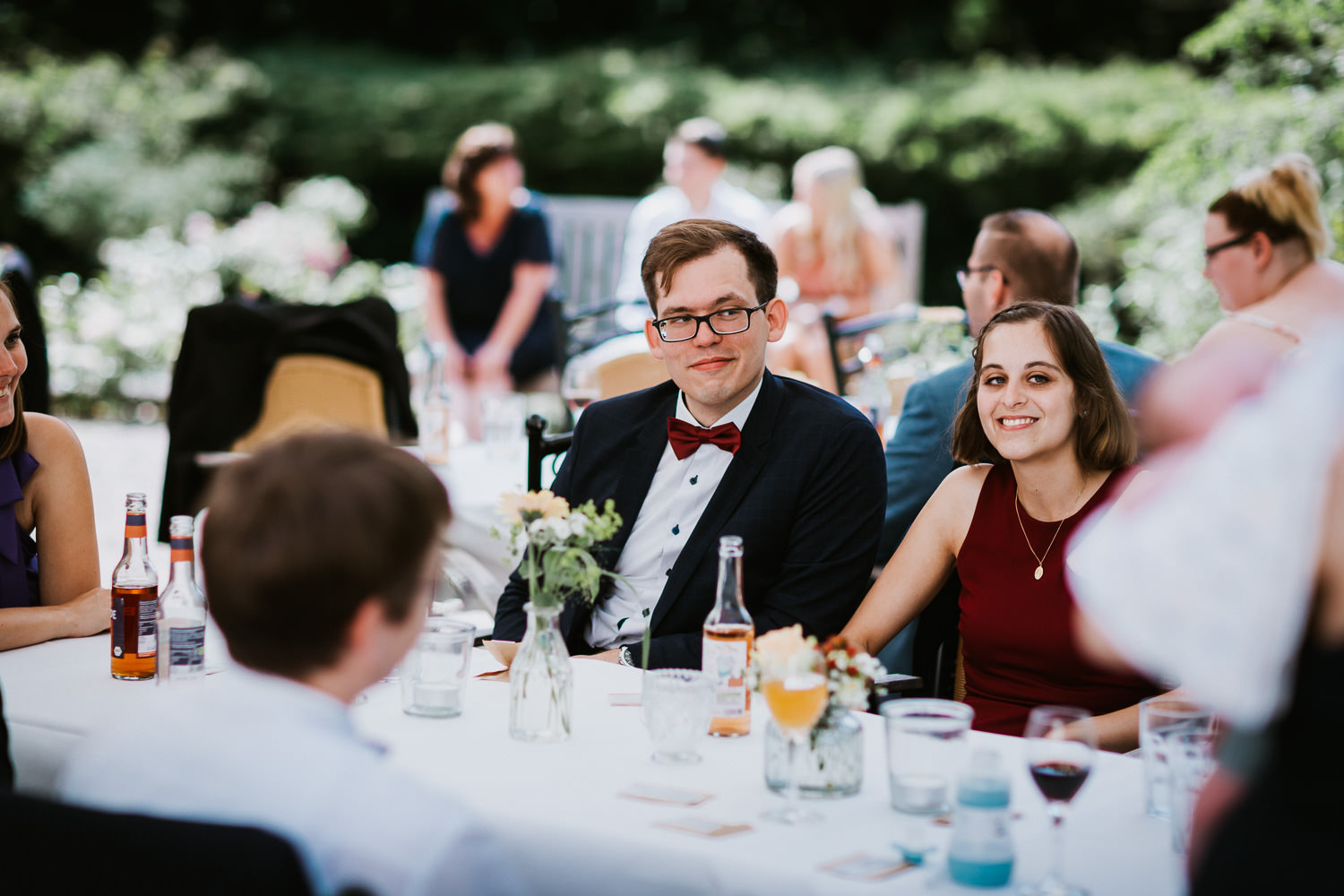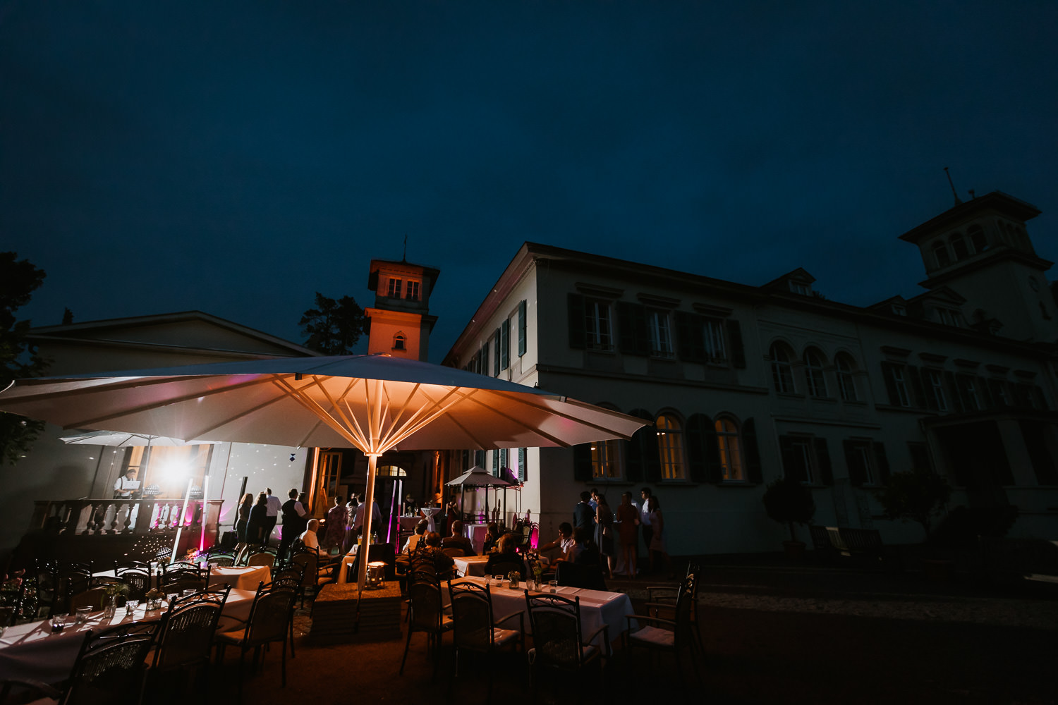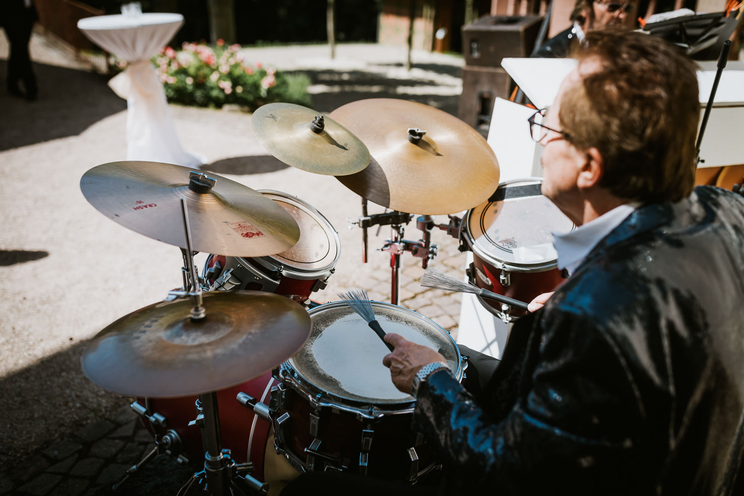Nach der feierlichen Trauung fuhren wir dann ein paar Meter weiter zum Schloss Heiligenberg. Es gibt hinter der Location ausreichende Parkmöglichkeiten. Da das Wetter wieder einmal unfassbar gut war, fand der Sektempfang im Außenbereich statt. Begleitet wurde dieser von einer tollen Band. Bei ausgelassener Stimmung machten wir zu späteren Stunde das Portraitshooting in. In der Zwischenzeit wurde die Hochzeitsgesellschaft mit kleineren Spielen beschäftigt. Sehr beliebt sind hier unter anderem Gästebücher, Malaufgaben und natürlich das Photobooth.