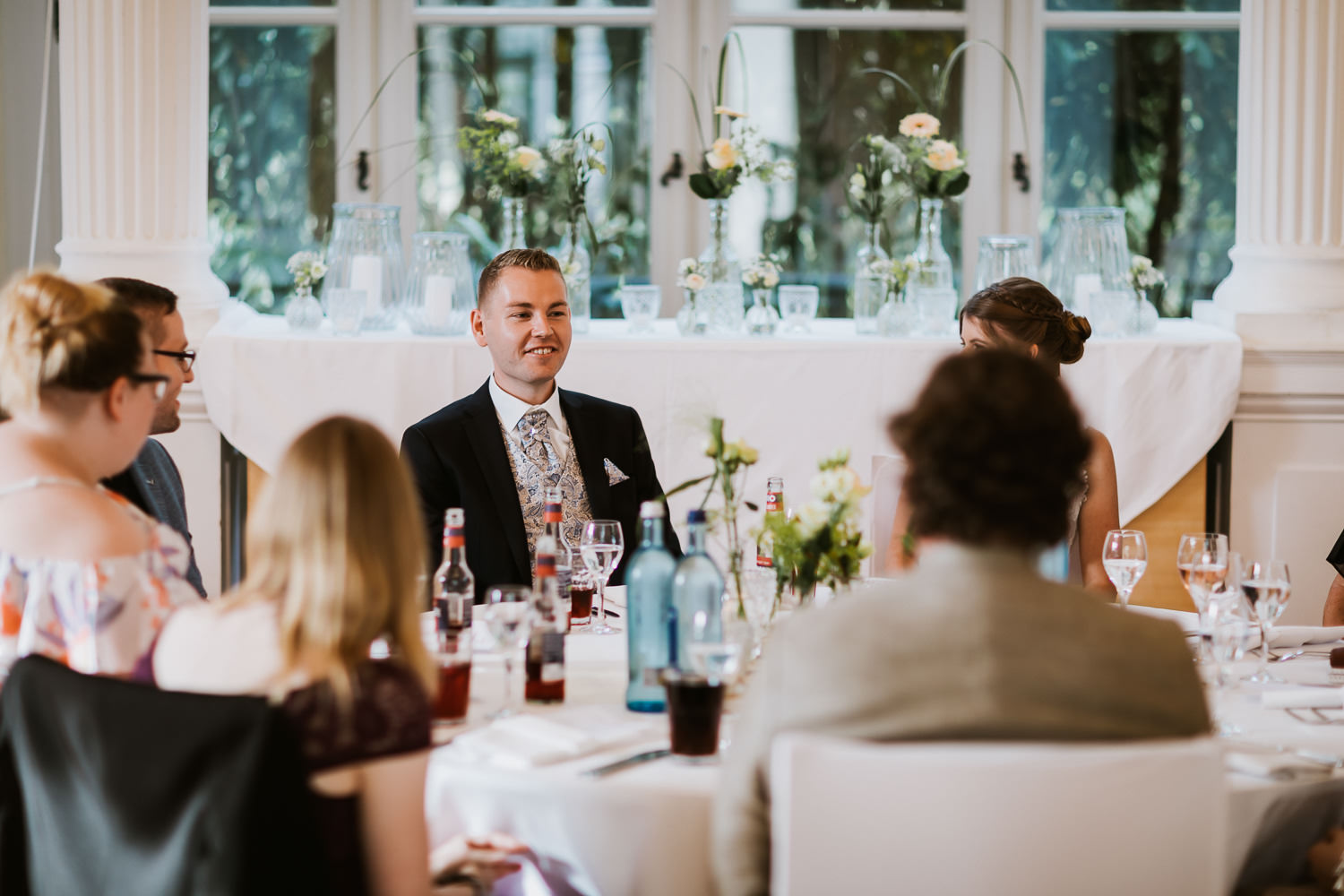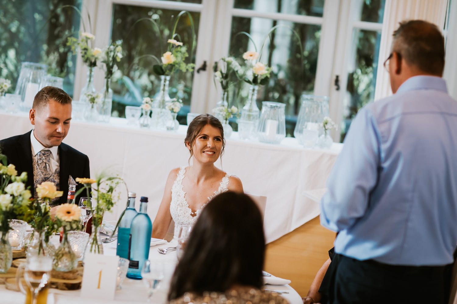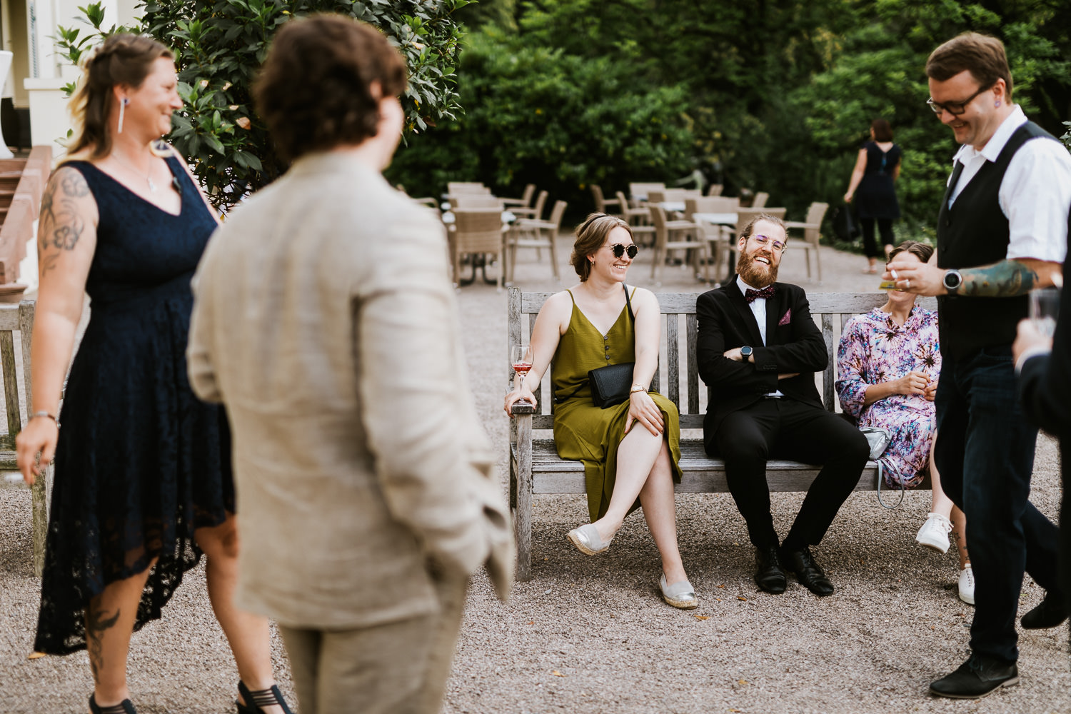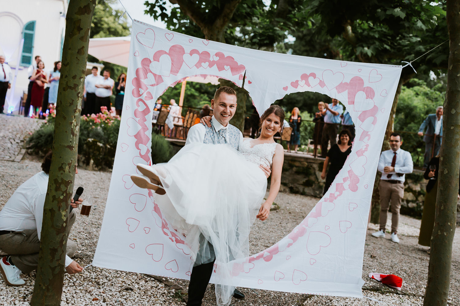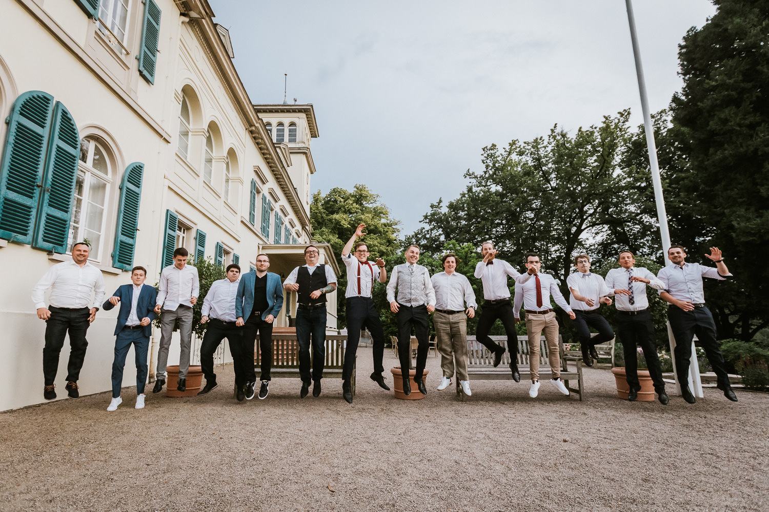 Nach der feierlichen Trauung fuhren wir dann ein paar Meter weiter zum Schloss Heiligenberg. Es gibt hinter der Location ausreichende Parkmöglichkeiten. Da das Wetter wieder einmal unfassbar gut war, fand der Sektempfang im Außenbereich statt. Begleitet wurde dieser von einer tollen Band. Bei ausgelassener Stimmung machten wir zu späteren Stunde das Portraitshooting in. In der Zwischenzeit wurde die Hochzeitsgesellschaft mit kleineren Spielen beschäftigt. Sehr beliebt sind hier unter anderem Gästebücher, Malaufgaben und natürlich das Photobooth.