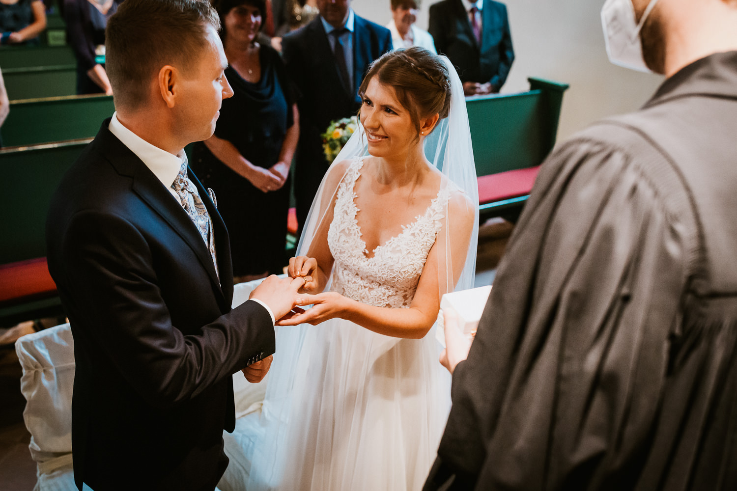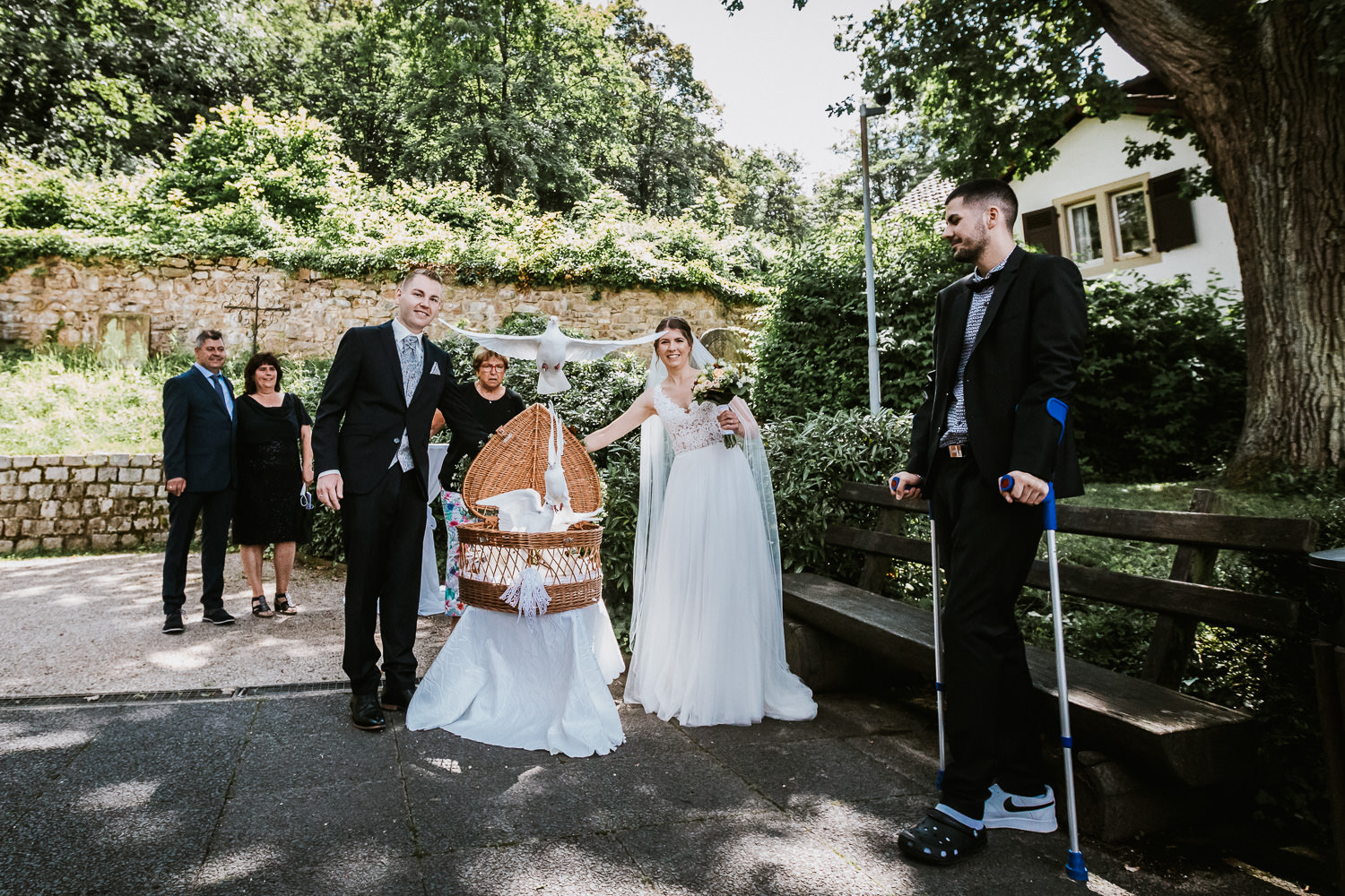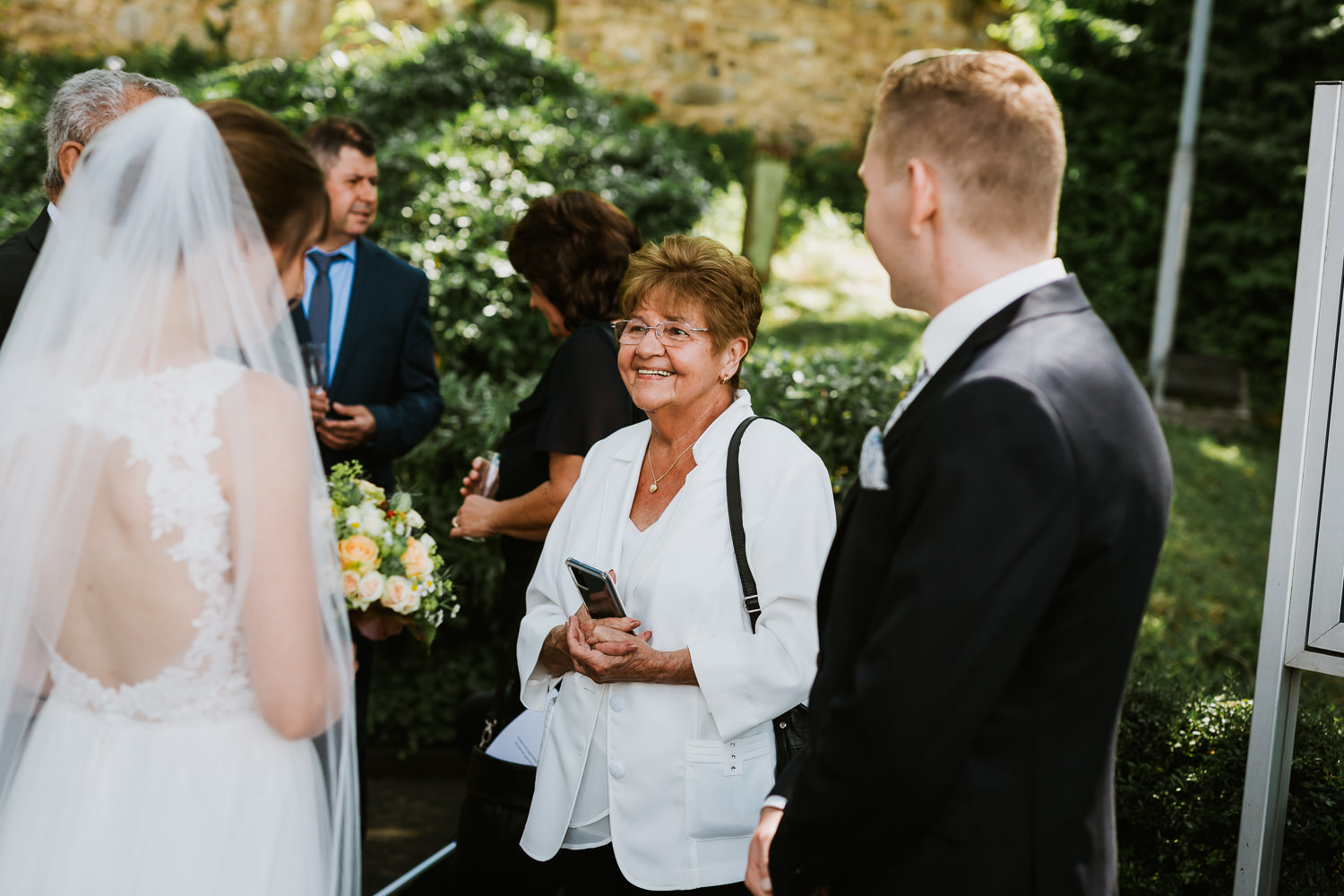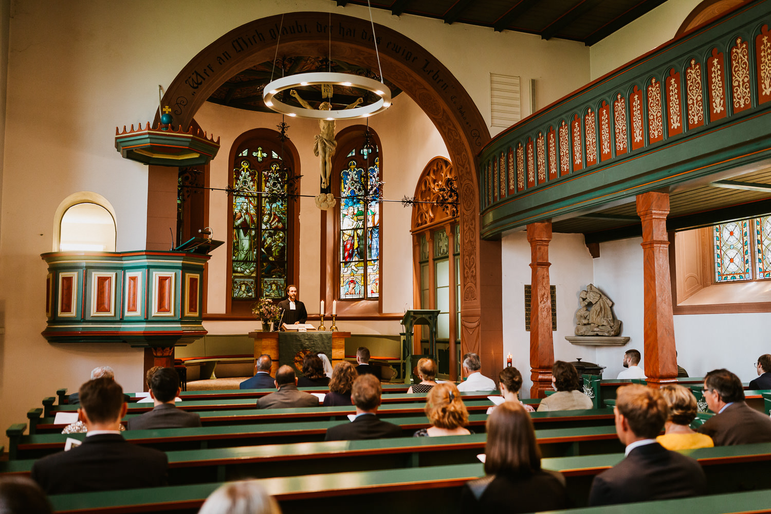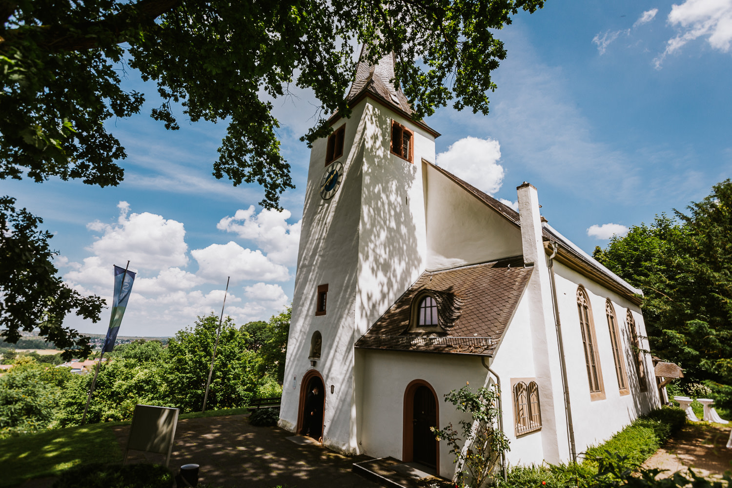 Nachdem die beiden fertig angezogen waren, machte ich mich auf den Weg zur Bergkirche Jugenheim nach Seeheim um die ankommenden Gäste zu fotografieren. Diese liegt nur unweit vom Schloss Heiligenberg entfernt. Nach der Trauung verweilten wir noch ein wenig vor der Kirche, um die vielen Beglückwünschungen entgegen zu nehmen.